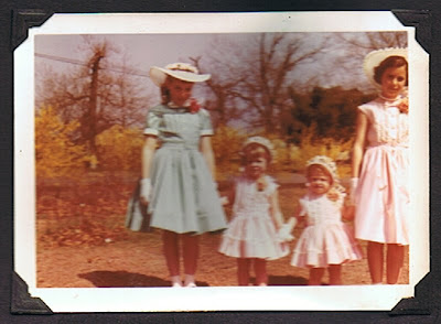 I wrote a bit about the infamous forsythia bushes aka "the yellow bushes" in a previous post. They were one of my father's all time favorite backdrops for family photo ops. Here I am in front of them with my siblings, Steven, Debby, Kenny and Sue, on Easter Sunday, 1958.